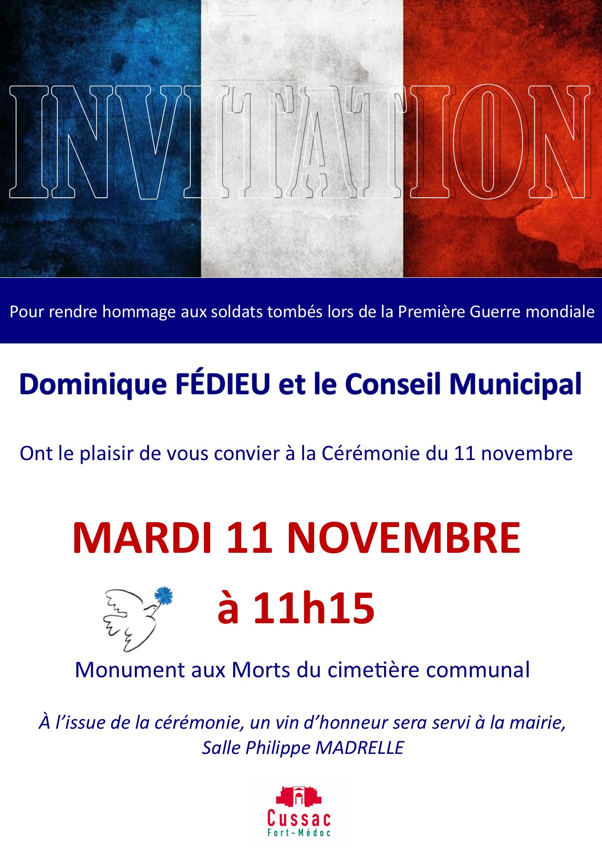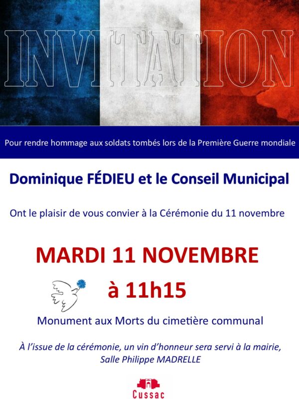 La cérémonie du 11 novembre aura lieu MARDI 11 NOVEMBRE à 11h15 au Cimetière communal.