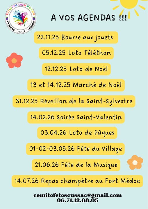 | COMITÉ DES FÊTES DE CUSSAC-FORT-MÉDOC Evénements à venir 2025-2026 | Katia PATARIN 5 Rue de la Devèze Appartement 102 33700 – Mérignac Tél : 06 67 00 52 31 comitefetescussac@gmail.com |